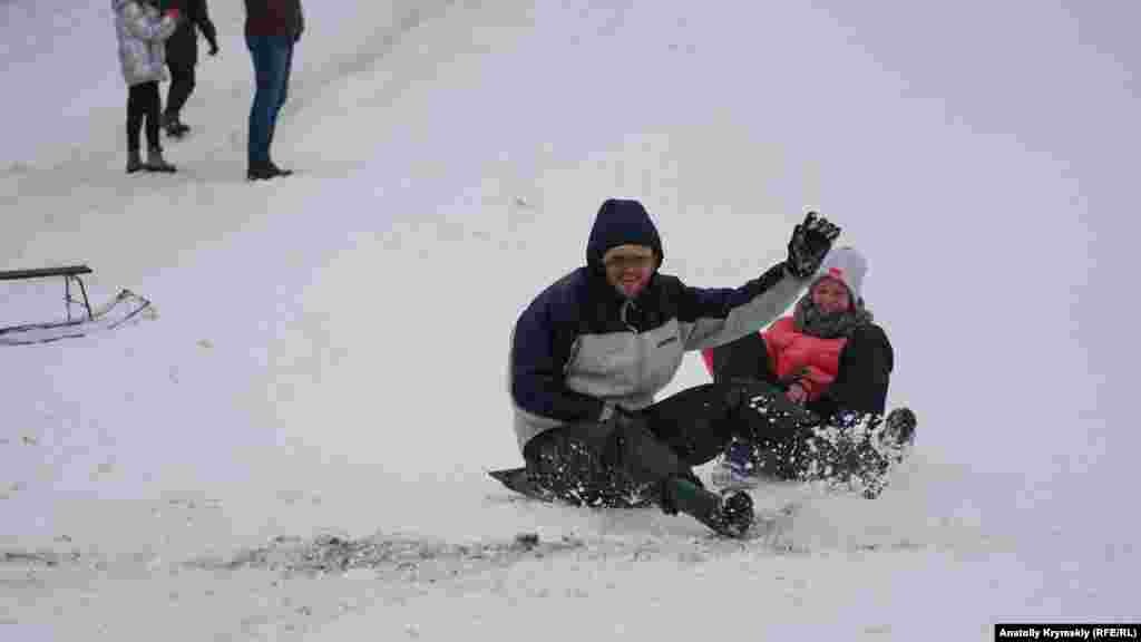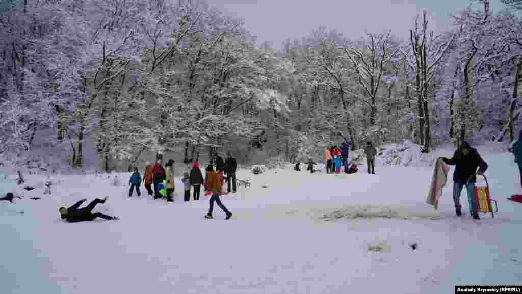 Буквально за день до наступления Нового года Ангарский перевал, как и другие горные массивы полуострова, особенно плато Ай-Петри, обильно засыпало снегом. При температуре чуть выше в дневное время он тут же начал таять, что, впрочем, не привело к дорожным заторам. На заезженном асфальте от него осталось мокрое место. А вот на деревьях и под ними в лесной горной местности снежный покров не уменьшился. Наоборот, только увеличивается, поскольку снег продолжает идти. Этим не преминули воспользоваться местные жители, отправившись с детьми на Ангарский район, в район подготовленного для активного зимнего отдыха учебного горнолыжного спуска возле старой турбазы.