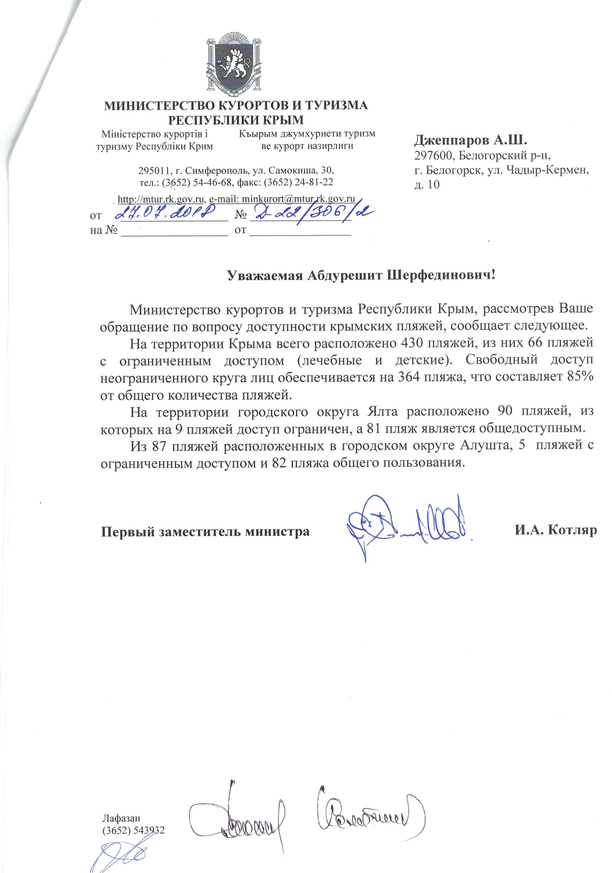 По информации активиста, он обращался с жалобой на ограничение доступности пляжей в российскую прокуратуру Крыма, и там ему ответили, что право пользования пляжами может быть ограничено российским законодательством. Например, статьей 11 Федерального закона от 30 марта 1999 года № 52-ФЗ «О санитарно-эпидемиологическом благополучии населения» установлено, что индивидуальные предприниматели и юридические лица в соответствии с осуществляемой ими деятельностью обязаны выполнять требования санитарного законодательства, обеспечивать безопасность для здоровья человека выполняемых работ и оказываемых услуг. Исходя из того, что положениями Федерального закона от 30 марта 1999 года № 52-ФЗ «О санитарно-эпидемиологическом благополучии населения» и санитарных правил СанПиН 4060-85 «Лечебные пляжи. Санитарные правила устройства, оборудования и эксплуатации» установлены обязательные требования к лечебным пляжам и их использованию, юридическими лицами могут вводиться ограничения на их посещение и использование».